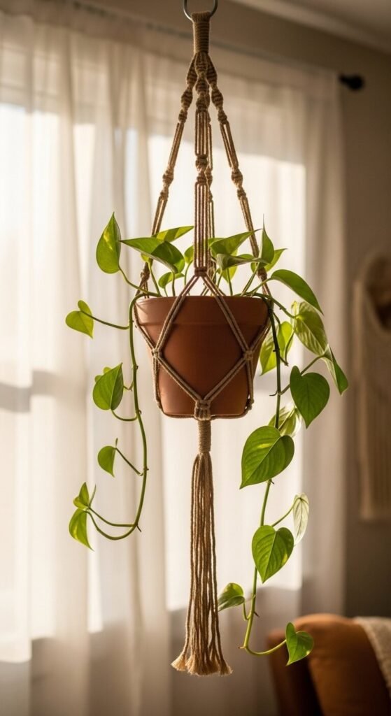 Knot a simple macramé cradle from jute twine or cotton rope and hang a terracotta pot inside it. You only need to learn two basic knots — a square knot and a gathering knot. There are free tutorials on YouTube that take about 20 minutes to follow. Hang the finished planter near a window and plant a trailing pothos or ivy inside. The combination of the rough orange clay against natural fiber rope creates a warm, layered look. A single skein of jute twine costs about $3 and makes two or three hangers.