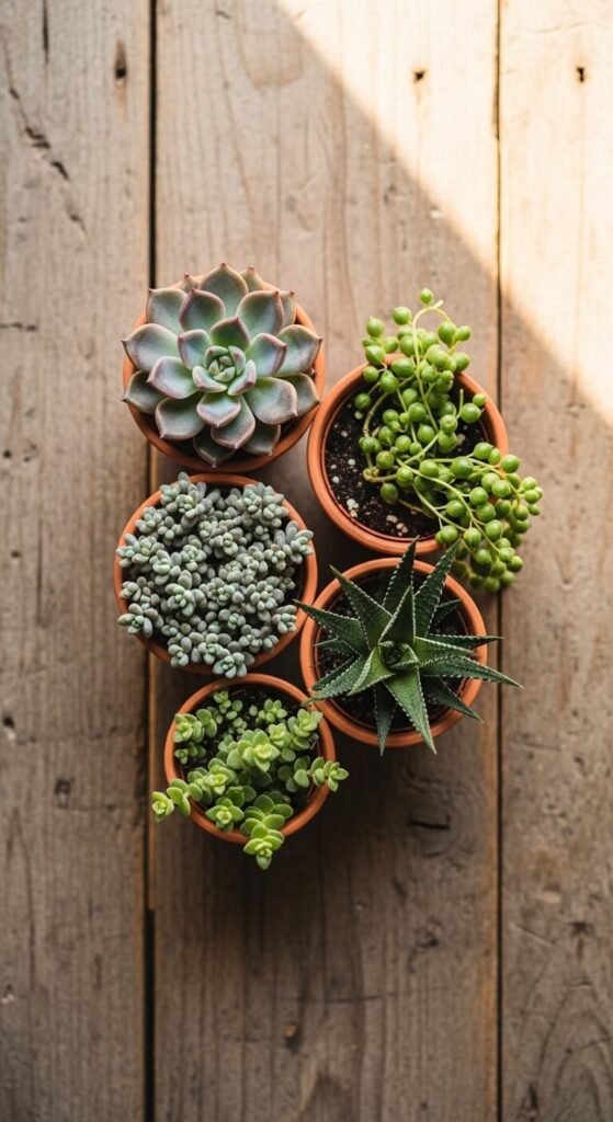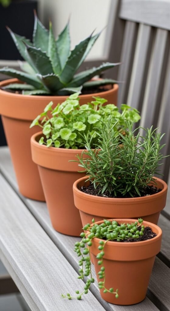 Succulents and terracotta are one of the most natural pairings in gardening. The porous clay draws away excess moisture, which is exactly what succulents want. Use a mix of 2-inch, 3-inch, and 4-inch pots. Plant one succulent variety per pot. Then cluster all the pots together on a tray or wooden board. The result looks like a carefully arranged collection even though each pot took under two minutes to plant. Fill in gaps with a little decorative gravel or sand. Succulents at hardware stores often cost as little as $2 to $4 each.