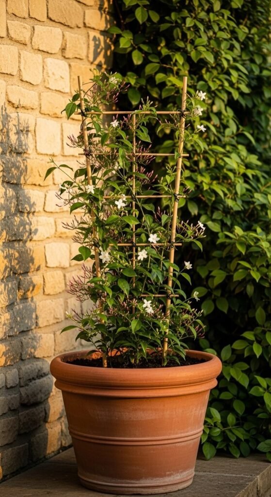 Push three or four bamboo canes into a large terracotta pot, angled slightly inward, and tie their tops together with twine to form a simple teepee trellis. Plant a climbing plant at the base — jasmine, sweet peas, or small climbing roses work beautifully. As the plant grows, guide it up and around the structure. The terracotta pot provides good weight so the whole arrangement stays stable even on a windy balcony. Bamboo canes cost about $2 to $3 for a bundle. This gives vertical structure to flat garden spaces.