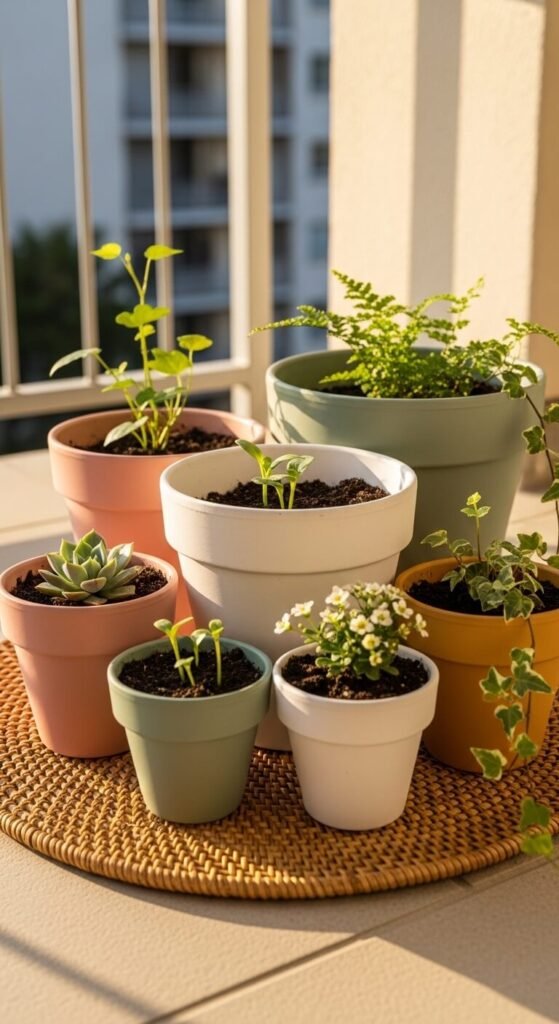 Paint a group of terracotta pots in a muted, earthy palette — dusty sage, terracotta red, warm cream, and sandy ochre. Use flat acrylic craft paint and leave some of the original clay visible for a natural, worn effect. Cluster all the pots together on a rattan tray or woven mat. Mix sizes from 3 inches to 10 inches. Plant different textures inside — some spiky, some trailing, some full and bushy. The variety of plant shapes and the cohesive painted palette together create a look that feels curated but completely relaxed.