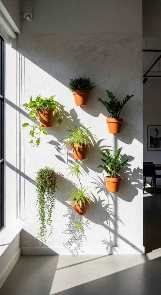 Mount terracotta pots directly to a wall using mounted clay pot hangers or simple pipe brackets available at hardware stores. Arrange them in a loose grid or staggered pattern. Plant trailing houseplants like string of pearls, pothos, or ivy so the plants drape downward and add movement to the wall. The combination of the clay pots against a painted plaster or white wall creates a gallery-like effect. This approach turns a dead wall into a living display. Measure your spacing before drilling so the arrangement feels balanced and intentional.