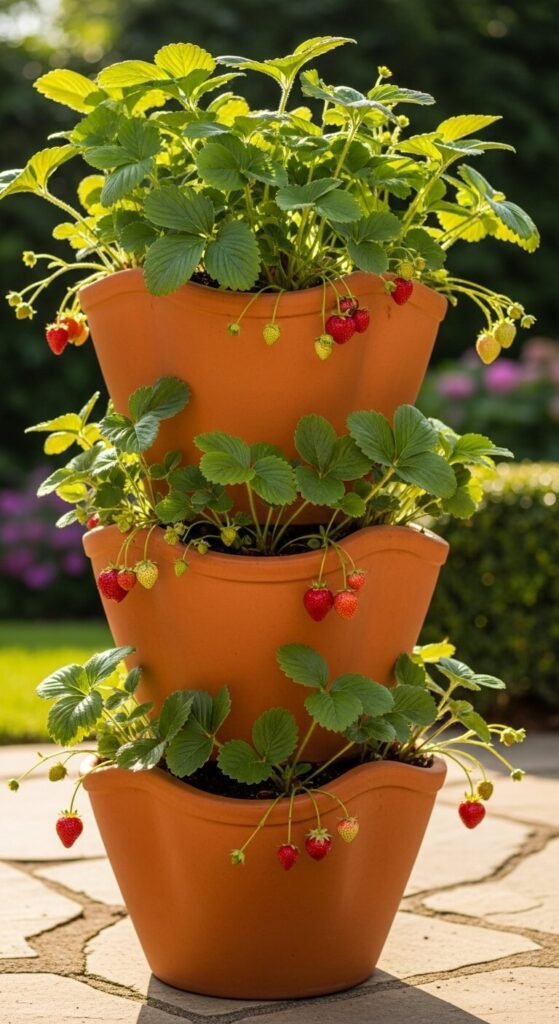 A purpose-made terracotta strawberry pot has small side openings all around its body. Plant a strawberry runner in each opening and one in the top. As the plants grow, they spill outward from every hole, producing fruit all around the pot. You can find these at nurseries and garden centers for about $10 to $20. They also work beautifully with small trailing herbs like thyme and oregano. The terracotta keeps the roots cooler than plastic pots on hot summer days, which strawberries genuinely appreciate. Water from the top and let it filter through each layer.