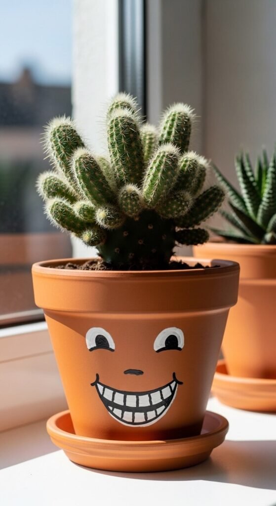 Use black acrylic paint and a thin brush to paint a simple face on the front of a terracotta pot. Add eyes, a nose, and a mouth. Then plant something dramatic out of the top — a wild cactus, a spiky grass, or a fluffy fern that becomes the character’s hair. These take about 15 minutes to make and cost almost nothing. They make genuinely good gifts and look charming on windowsills or desks. You don’t need to be able to draw well. Simple, even clumsy, faces often have more personality than perfectly painted ones.