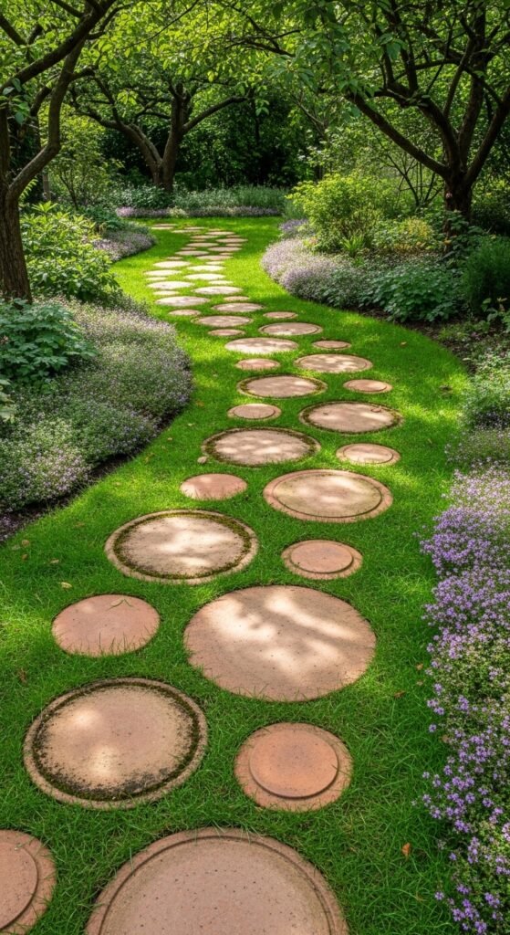 Large terracotta saucers — the wide, flat ones that go under pots — can be pressed directly into the soil to create informal garden stepping stones. Space them evenly across a garden bed or lawn path. Over time, moss and ground cover will grow around the edges, making them look as if they’ve always been there. Saucers in 10-inch to 14-inch sizes work best for stepping. They’re inexpensive and far more interesting than plain concrete stepping stones. Add a little sand underneath each one for stability and to prevent rocking underfoot.