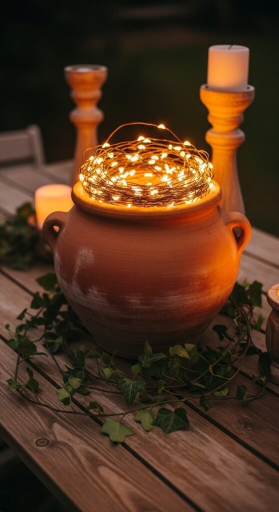 Fill a large terracotta pot with a loose, coiled string of warm white or amber fairy lights. Leave the pot unplugged and run the cord out of the drainage hole. Plug it in at night. The pot glows from within with a soft, amber warmth that the clay texture amplifies beautifully. Add dried flowers, pine cones, or trailing fake ivy around the top opening for extra texture. This works on patios, inside on shelves, or as a table centerpiece. A basic set of fairy lights costs about $5 to $8. The effect far outweighs the cost.