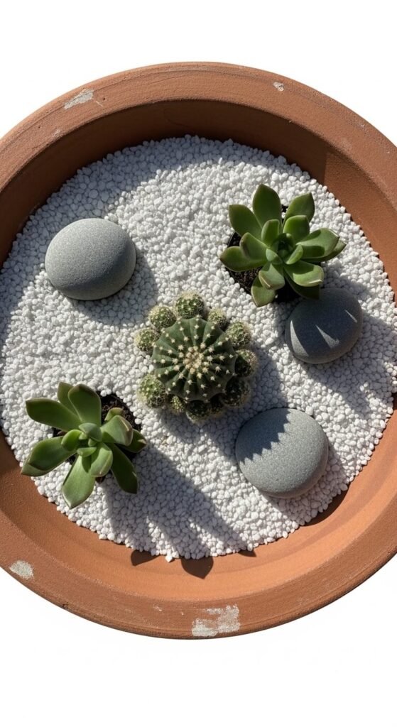 Fill a wide, shallow terracotta bowl with a thin layer of cactus mix soil, then top with fine white or buff-coloured gravel. Plant three to five small cactus or succulent varieties, spacing them asymmetrically for a natural feel. Press a few smooth river stones into the gravel to add contrast. The result is a miniature desert landscape that needs watering only once every two to three weeks. Wide, shallow terracotta bowls are often found cheaply at pottery or garden clearance sales. This looks striking on a desk, outdoor table, or a sunny bathroom windowsill.