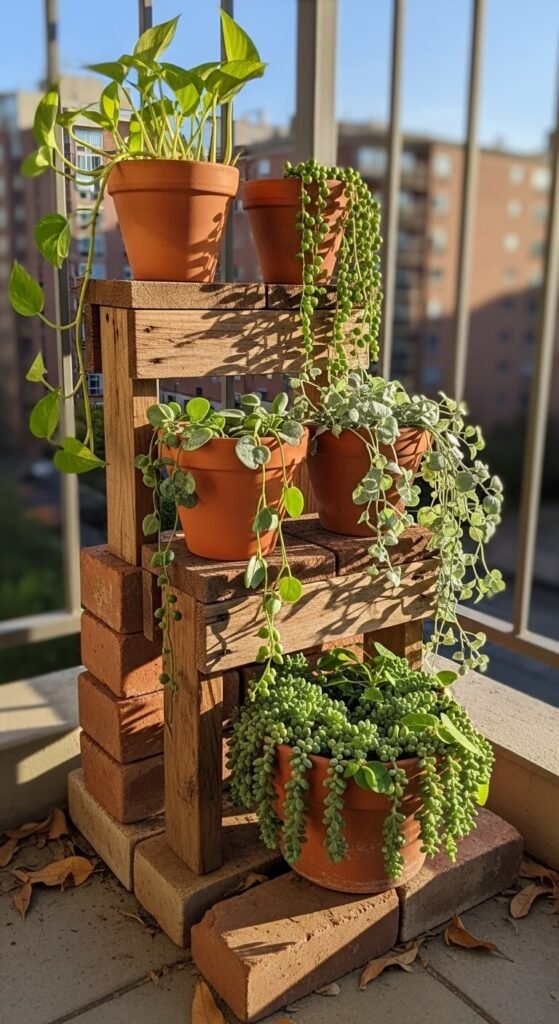 Build a simple tiered display using stacked bricks and wooden planks to create two or three shelves. Place terracotta pots of varying sizes across each level. The tallest plants go on the bottom tier; trailing plants go on the top so they can cascade downward. The whole structure can be assembled without tools in under 30 minutes. Reclaimed bricks cost nothing if you salvage them. Old scaffold boards from a builder’s yard work perfectly as shelves. This approach turns even a narrow balcony into a layered, lush planting wall that looks like it was designed by a professional.