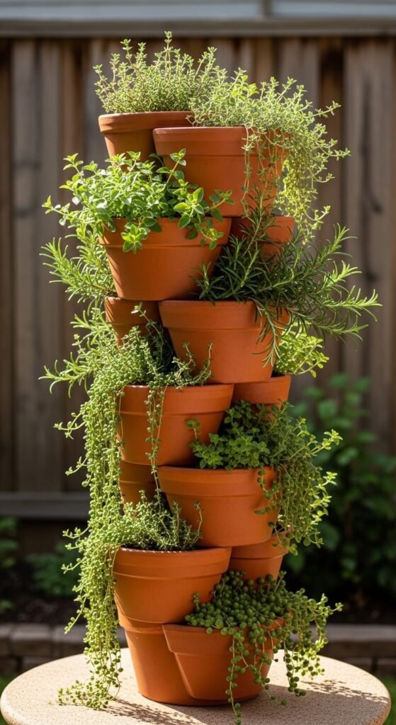 Stack pots of decreasing sizes directly on top of each other to build a vertical tower garden. Fill each tier with herbs, strawberries, or succulents. The bottom pot is largest; the smallest sits on top. Use a wooden dowel through the drainage holes to keep everything stable. This works beautifully in small spaces. You can find mismatched terracotta pots at thrift stores for under $2 each. Total cost: under $10. It grows upward instead of outward — perfect for tight patios or balconies.