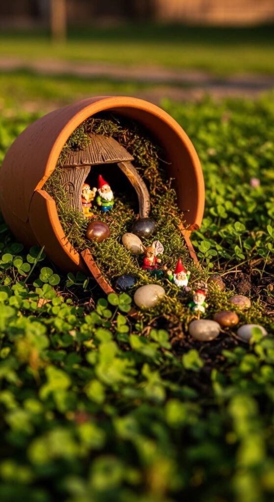 Don’t throw away a cracked or broken terracotta pot. Lay it on its side and use the break as a dramatic opening. Fill the inside with potting soil, then plant miniature succulents, moss, and small trailing plants. Add tiny stones, pebbles, or figurines to build a little scene. This is a zero-cost project if you already have a broken pot. Children love helping with this one. It looks completely intentional and adds a storytelling quality to any garden corner or porch step.