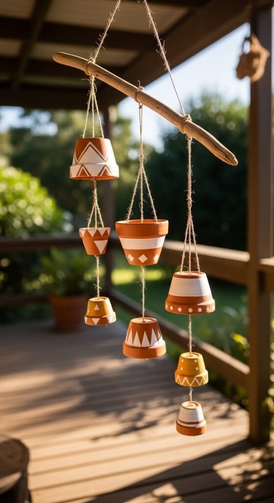 Drill a small hole in the bottom of several small terracotta pots. Thread them onto a long piece of twine or jute rope at different lengths. Hang the whole arrangement from a branch, a porch beam, or a curtain rod. When the breeze hits, the pots knock together with a soft, hollow, earthy sound. You can leave the pots plain or paint simple patterns on them first. Use pots ranging from 2 to 4 inches for the best sound variation. This is a weekend project that costs next to nothing.