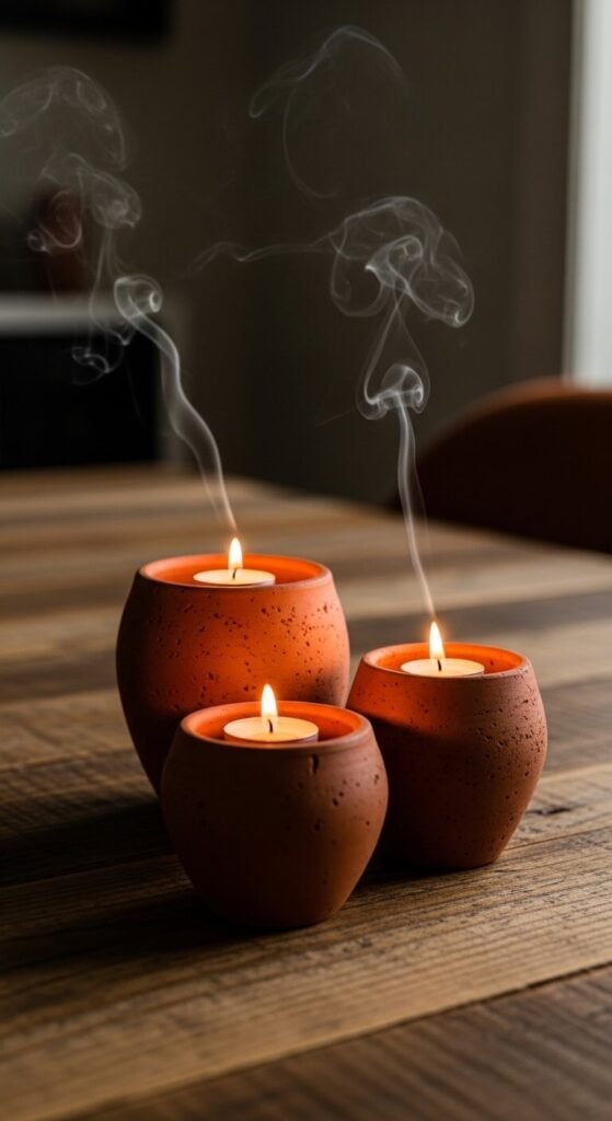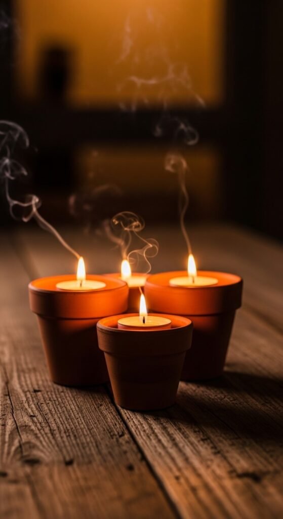 Small terracotta pots make surprisingly beautiful candle holders. Drop a tea light or votive candle directly inside a clean 3-inch pot. The clay acts as a natural heat buffer and gives off a warm, amber glow. Group three or five pots of different heights together for a simple centerpiece. You can press a little sand into the base of each pot first for extra stability. This costs almost nothing if you already have pots on hand. It works on dining tables, mantels, outdoor patios, and window ledges.