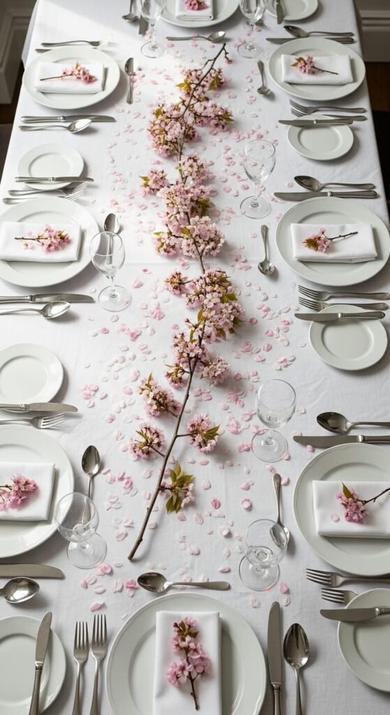 Lay cherry blossom branches horizontally down your table center. Use 3-5 branches depending on table length. No vase needed—just arrange directly on table. Add votives between branches for candlelit dinners. This works for casual meals or formal entertaining. Swap out weekly with fresh stems or keep silk ones permanently. Layer over a white runner for contrast. Takes two minutes to arrange but looks expensive.
