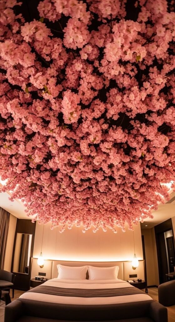 Create an overhead canopy using multiple blossom branches. Attach to ceiling with removable hooks in a grid pattern. Budget $30-40 for full coverage. This works best in bedrooms or reading nooks. The branches hang down slightly, creating an intimate space. Mix with sheer fabric for added softness. Perfect for creating a romantic sleeping area. Installation takes about an hour with a helper.
