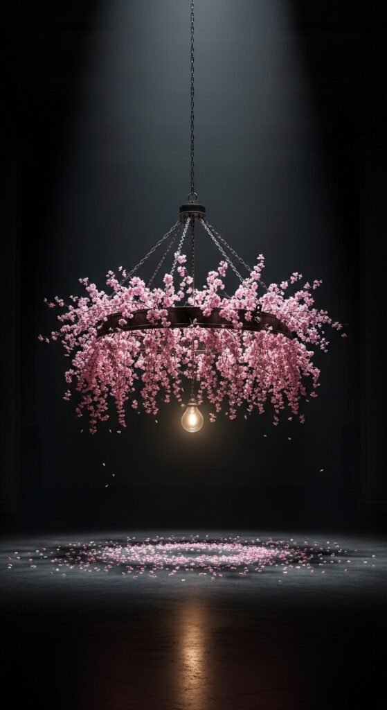 Wrap cherry blossom stems around a simple wire chandelier frame. Find frames at craft stores for $15-20. Weave stems through metal, securing with thin wire. Hang over dining tables or in entryways. Add a simple bulb in center for function. This DIY statement piece looks custom-made. Takes two hours to complete. Creates dramatic overhead interest in any room.