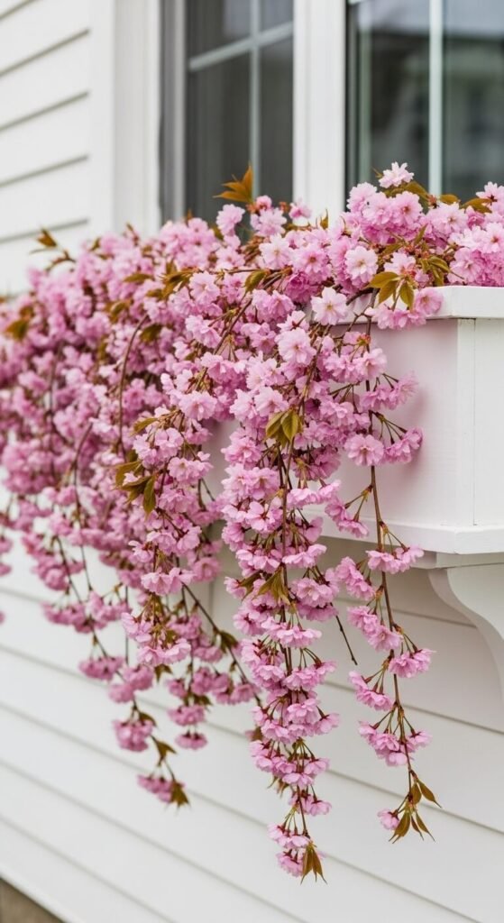 Fill window boxes with tall cherry blossom stems. Window boxes cost $10-15 at garden centers. No soil needed for artificial stems—just arrange in boxes. Secure stems to box edges with florist tape. This adds curb appeal without planting. Works on indoor or outdoor windows. Change out seasonally for different looks. Creates the illusion of blooming trees outside your windows.