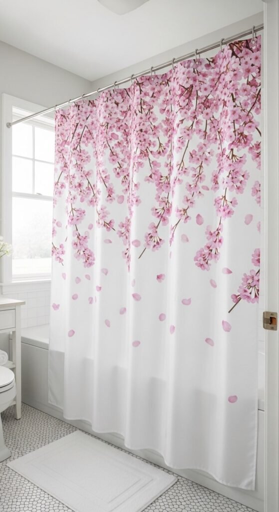 Attach lightweight cherry blossom stems to your shower curtain rings. Let them hang down the outside of the curtain. This costs under $10 using existing curtain. Creates a spa-like bathroom atmosphere. The stems stay dry outside the shower. Secure with small clothespins or zip ties. Change stems monthly to keep fresh looking. This simple addition transforms basic bathrooms instantly.
