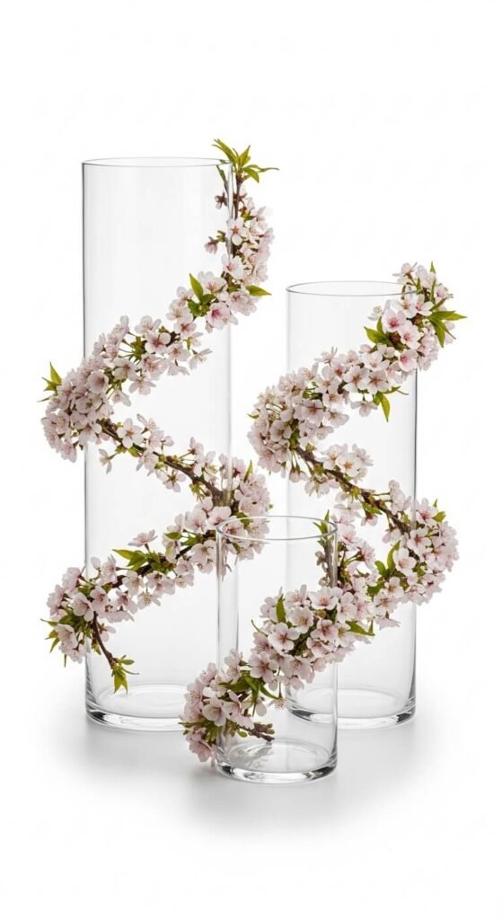 Wrap cherry blossom garlands around plain glass vases. Secure with clear tape or hot glue. Transform dollar store vases into decorative pieces. The spiraling blooms hide plain glass. Stack different heights together for impact. Fill with more branches or leave empty. This technique works on any cylindrical vase. Adds texture and color to neutral spaces instantly.