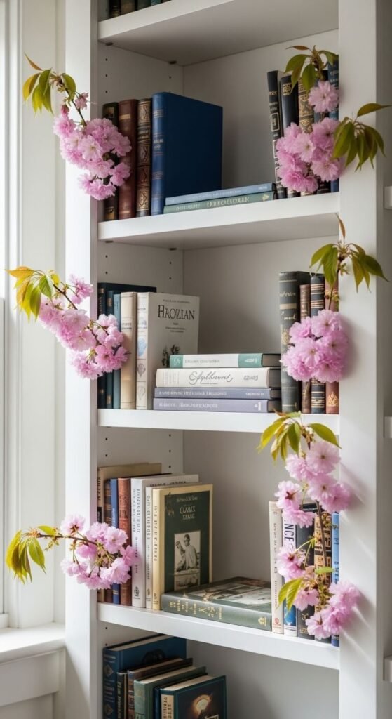 Tuck cherry blossom stems between books on shelves. Let blooms cascade over shelf edges. Use branches you already have for zero cost. This softens hard bookshelf lines. Mix with small votives for dimension. The vertical arrangement draws eyes upward. Change placement monthly to prevent dust. Works with any bookshelf style. Adds life to static book displays.