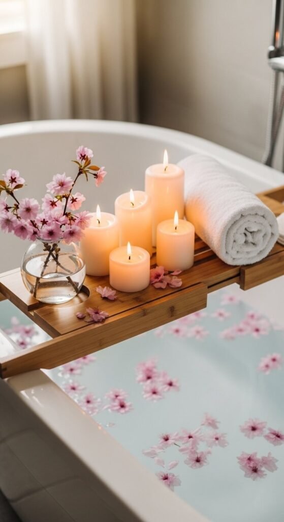 Style your bath tray with a small vase of cherry blossoms. Add floating petals in bathwater for romance. Light candles among the branches. This creates instant spa vibes at home. Use waterproof battery candles for safety. The combination of blooms and candlelight promotes relaxation. Perfect for Sunday evening wind-down rituals. Takes one minute to arrange but feels luxurious.