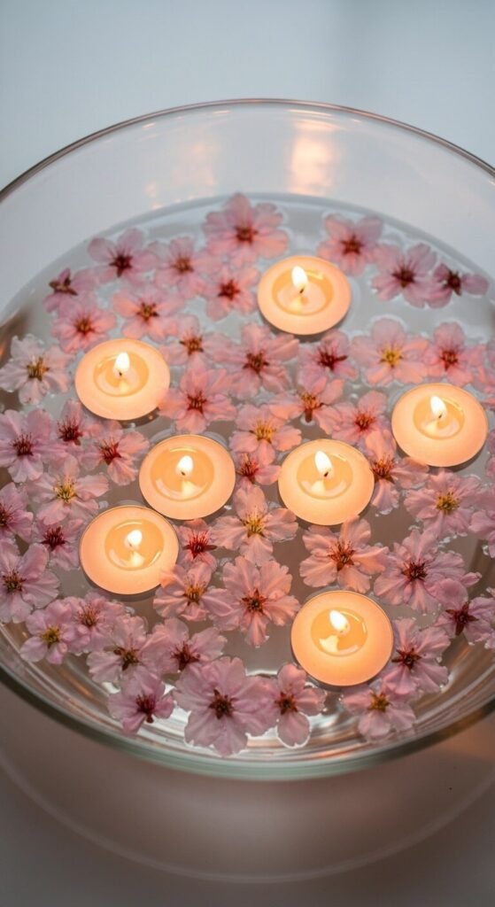 Fill a shallow glass bowl with water and scatter fresh or silk cherry blossoms across the surface. Add floating candles for evening ambiance. This costs under $10 using dollar store supplies. Change the water every few days if using real flowers. Place on your dining table, coffee table, or bathroom counter. The reflection creates double the beauty. Try adding a few drops of food coloring for a subtle tint. Works perfectly for dinner parties or quiet evenings at home.