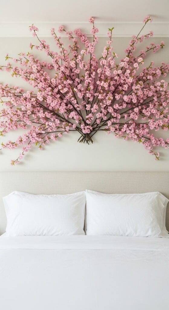 Mount cherry blossom branches in a fan pattern above your headboard. Use removable adhesive strips to avoid wall damage. Create a semi-circle or sunburst design. This draws attention to your bed as a focal point. Mix 3-5 branches of varying lengths. The arrangement frames your sleeping space romantically. Costs under $20 total. Installation takes 15 minutes alone.