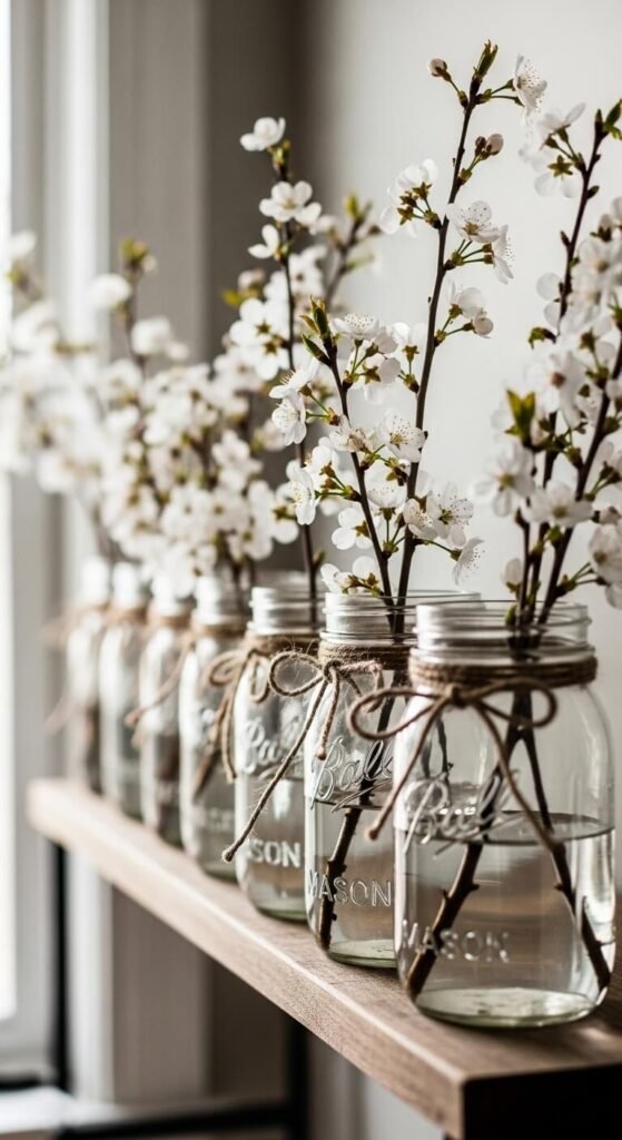 Fill mason jars with cherry blossom stems for casual charm. Mason jars cost $1 each or use ones you have. Wrap twine or burlap around rims. Line up on shelves, windowsills, or tables. This affordable option works for any decor style. Mix jar sizes for interest. Add water for fresh stems. Change arrangements weekly without buying new containers. Perfect for farmhouse or cottage aesthetics.