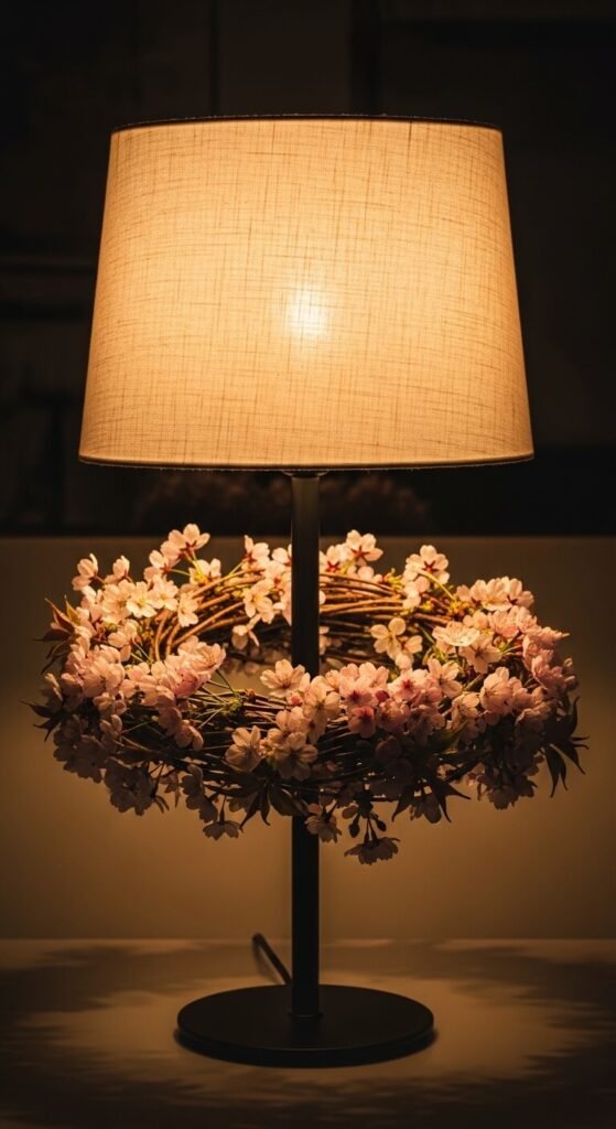 Arrange cherry blossom stems in a circle around table lamp bases. This costs nothing if you have existing stems. The blooms hide plain lamp bases. Light shining through petals creates subtle glow. Works on nightstands, side tables, or desks. Secure stems with clear tape underneath. Change seasonally for different looks. Simple five-minute refresh for any lamp. Creates cohesive look between lighting and decor.
