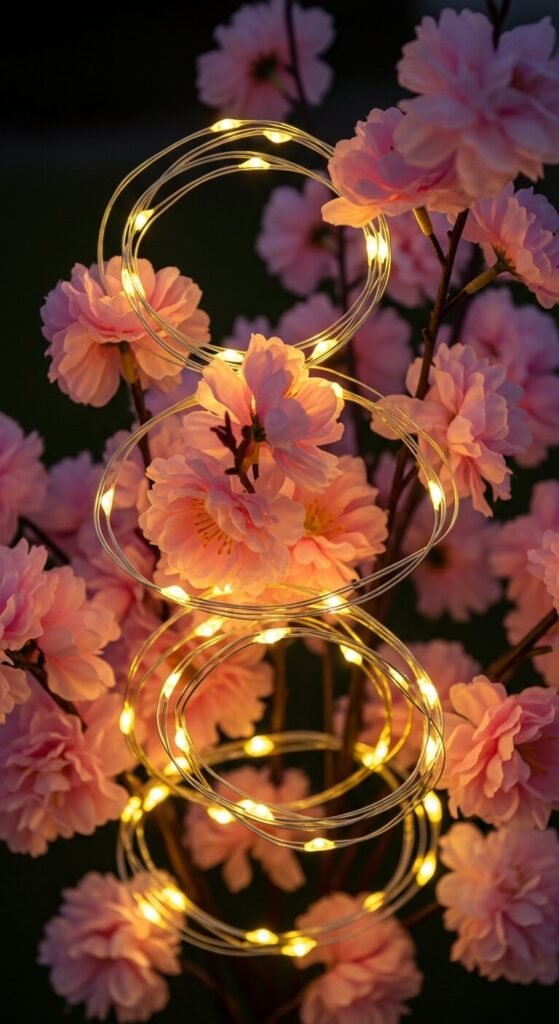 Weave battery-operated fairy lights through cherry blossom branches. LED string lights cost $6-10 and last for years. Wind them loosely so lights peek through petals. Place in tall vases or drape along walls. The combination creates a magical evening glow. Use warm white lights for romance. Set timers to turn on automatically at dusk. Perfect for bedrooms or outdoor patios.