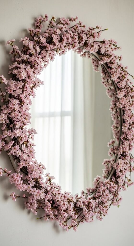 Hot glue cherry blossom stems around your mirror’s edge. Start at the top and work around symmetrically. This costs under $12 for enough flowers. Leave bottom section clear for practical use. The frame effect makes any mirror special. Works on round, square, or oval mirrors. Try clustering more blooms at top corners. Creates a feminine, romantic focal point in bathrooms or bedrooms.