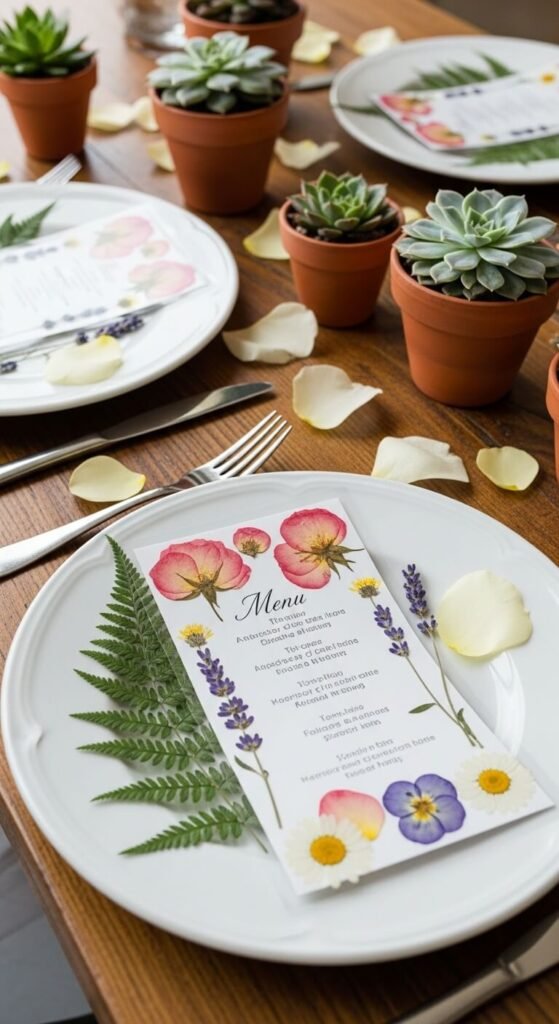 Create pressed flower menu cards or place cards. Press flowers between book pages for a week before your event.