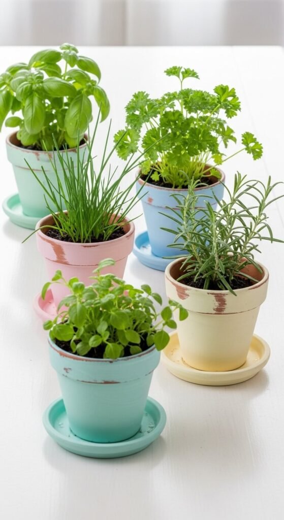 Paint small terracotta pots in pastel colors and fill them with herbs or small flowers. Space them down the table as a living centerpiece.