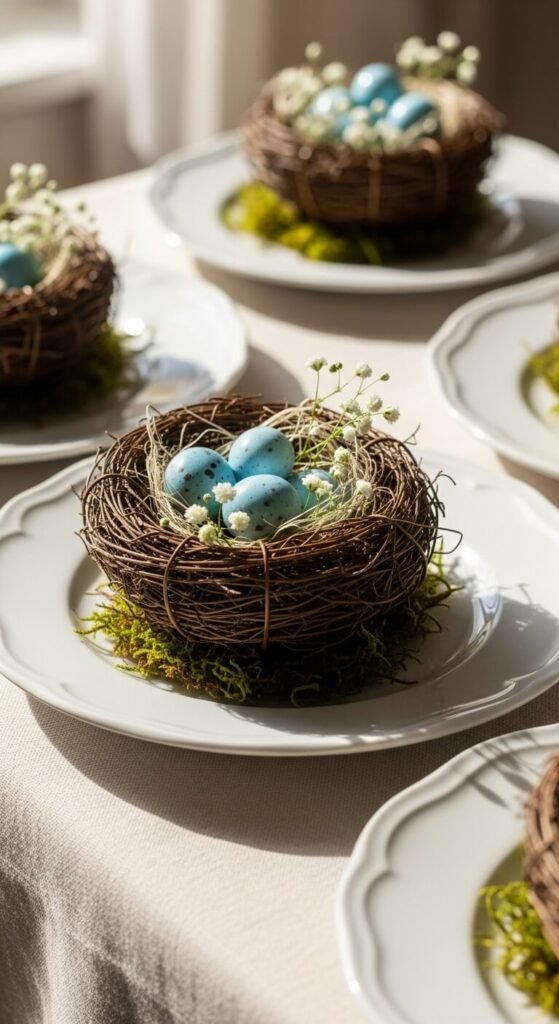 Add decorative nests with eggs or small flowers at each place setting. They’re a classic spring symbol.