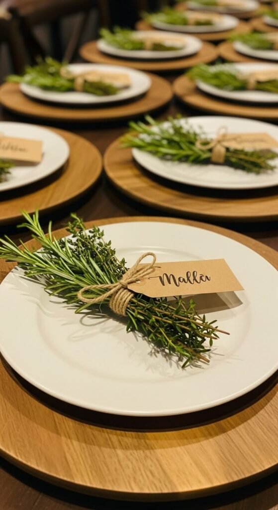 Tie fresh herbs like rosemary or thyme with twine and attach name tags. These double as place cards and favors.