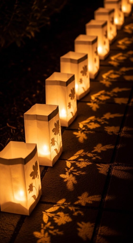 Paper bag luminaries are a classic outdoor lighting idea that still works beautifully. Cut floral shapes — tulips, daisies, or vines — into the sides of plain white paper bags. Add a little sand at the bottom for weight and drop in a battery LED light. Arrange them along a path, driveway edge, or patio perimeter. A bag of 20 white bags costs around $3. This is perfect for spring parties or evening garden gatherings where a gentle, warm glow sets the mood.
