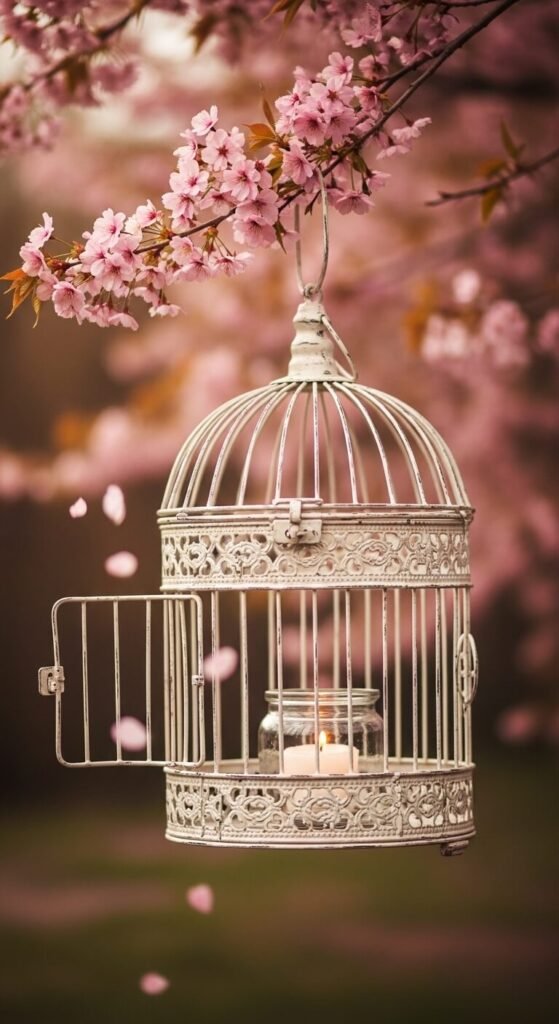 An old birdcage instantly becomes a lantern with one candle inside. Place a small glass jar with a tealight inside the cage so the flame is contained safely. Hang it from a porch beam or garden tree using chain or ribbon. Distressed white or antique brass birdcages have a romantic, garden-party feel. Check thrift stores or flea markets — they often go for $5–$15. Wrap a few fake or real flower stems around the outside for a finishing touch.