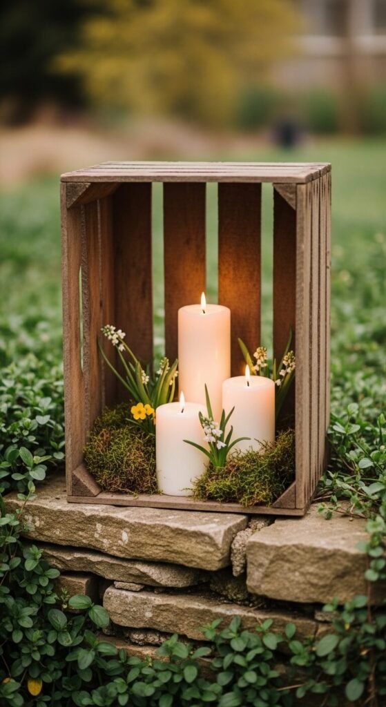 Wooden crates make surprisingly stylish lantern holders. Stack candles at different heights inside the crate — use a brick or small box to raise one — then tuck moss, pebbles, or flowers around the base. This creates a layered, styled look. Old fruit crates can often be found free at farmers’ markets or produce stores. Sand rough edges lightly and seal with outdoor varnish if using outside. This works on a porch, deck, or dining table.