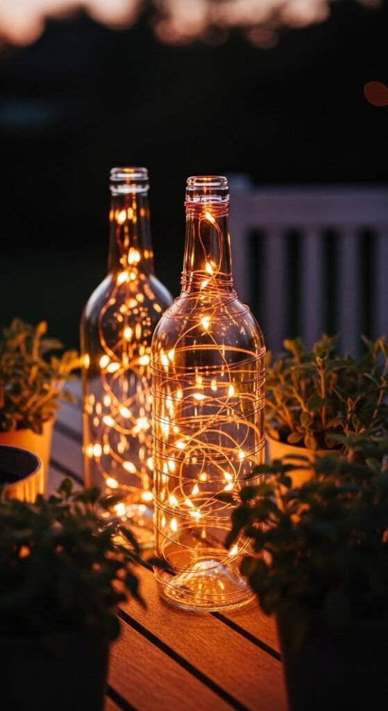 Save your glass wine or water bottles and turn them into lanterns. Wrap copper wire loosely around the outside and thread battery-powered fairy lights down through the neck into the bottle. The copper and glass together look truly beautiful at night. This costs practically nothing if you reuse bottles you already have. A small set of copper fairy lights runs about $5–$8. Arrange a group of three bottles at different heights for the best effect.