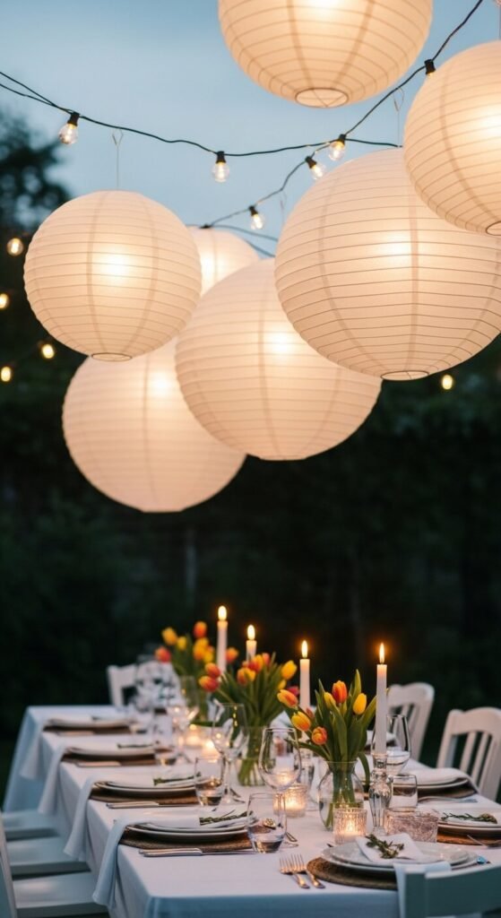 White paper lanterns strung overhead create instant ambiance for any outdoor dinner. Mix sizes — small, medium, and large — for a layered ceiling effect. Thread them onto outdoor string lights or hang them individually from a pergola. A pack of 10 assorted white paper lanterns costs around $10–$15 online. They are lightweight and easy to hang with a simple cup hook. Add a warm-toned LED bulb inside each one for a golden glow.