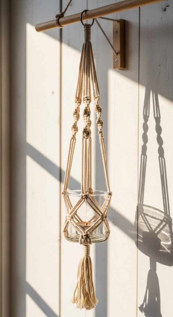 Macramé holders give lanterns a boho-spring look that feels very current. Basic macramé is simple to learn — a few square knots and spiral knots are all you need. Use natural cotton cord ($5–$8 for a roll) and a small glass lantern or mason jar. Hang from a ceiling hook, porch rafter, or wooden dowel. Tutorials are widely available online for free. This is a calming weekend project that produces something genuinely beautiful.