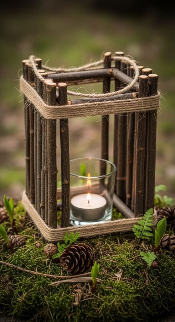 Collect straight twigs from the garden after winter pruning and build a simple frame. Tie four sets of parallel twigs together with jute twine to form four sides and a base, then set a small glass votive inside. This takes about 20 minutes and costs nothing if you use what’s already in your yard. The result has a raw, woodland-spring charm that works beautifully on outdoor tables or indoor shelves styled with moss and stones.