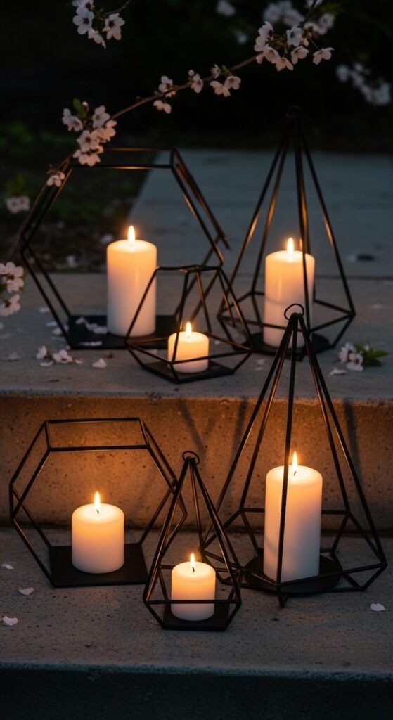 Geometric lanterns in matte black or gold are one of the most popular spring styles right now. Group three together at different heights for a statement arrangement on a step, shelf, or table. These are widely available at home stores and online retailers for $10–$30 each. They work in modern, Scandinavian, and even bohemian interiors. Place a white pillar candle inside for clean contrast against the metal frame. No decorating skill required — the shape does all the work.