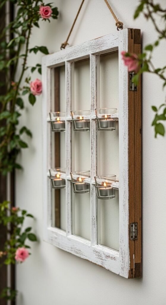 Old window frames from salvage yards or flea markets become one-of-a-kind lantern displays. Mount small glass votives at each pane of the frame using wire or adhesive hooks. Hang it flat against an outdoor wall or fence. Paint the frame white, sage green, or left natural for a weathered look. This is a weekend project that costs $5–$20 depending on where you source the frame. It is the kind of thing that makes every guest stop and ask where you got it.