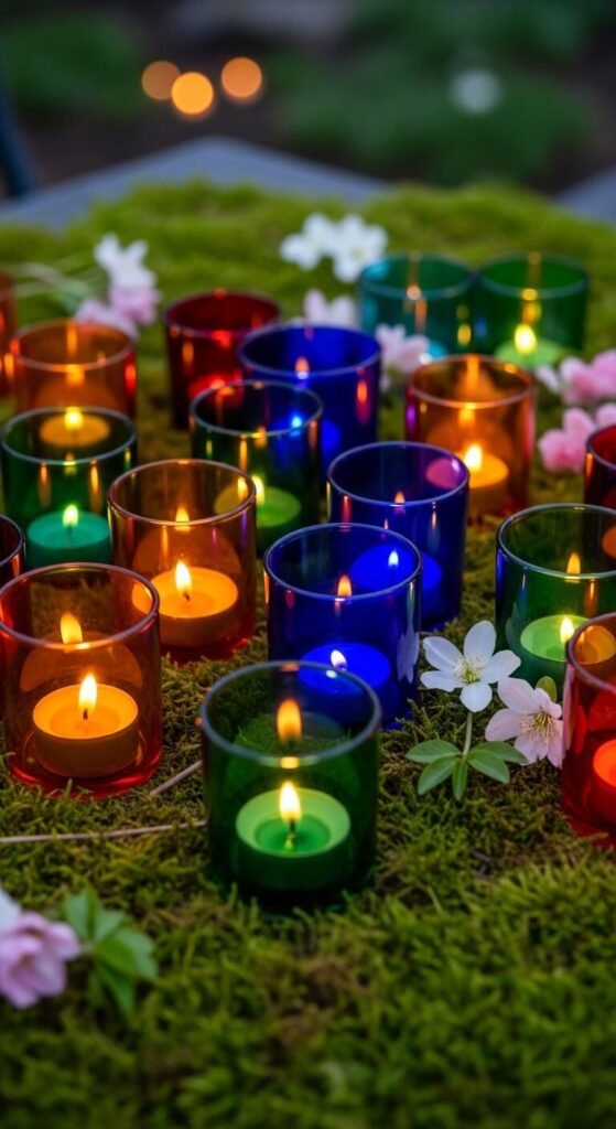 A cluster of colored glass votives is one of the simplest spring lantern ideas with maximum visual impact. Group 7–12 votives of different heights and colors closely together on a flat surface. The jewel-toned glass — amber, cobalt, green — looks stunning in daylight and magical when lit at night. Colored glass votives are available in bulk online for very little. Nestle them in a layer of moss or pebbles for a styled, finished look. Zero assembly required.