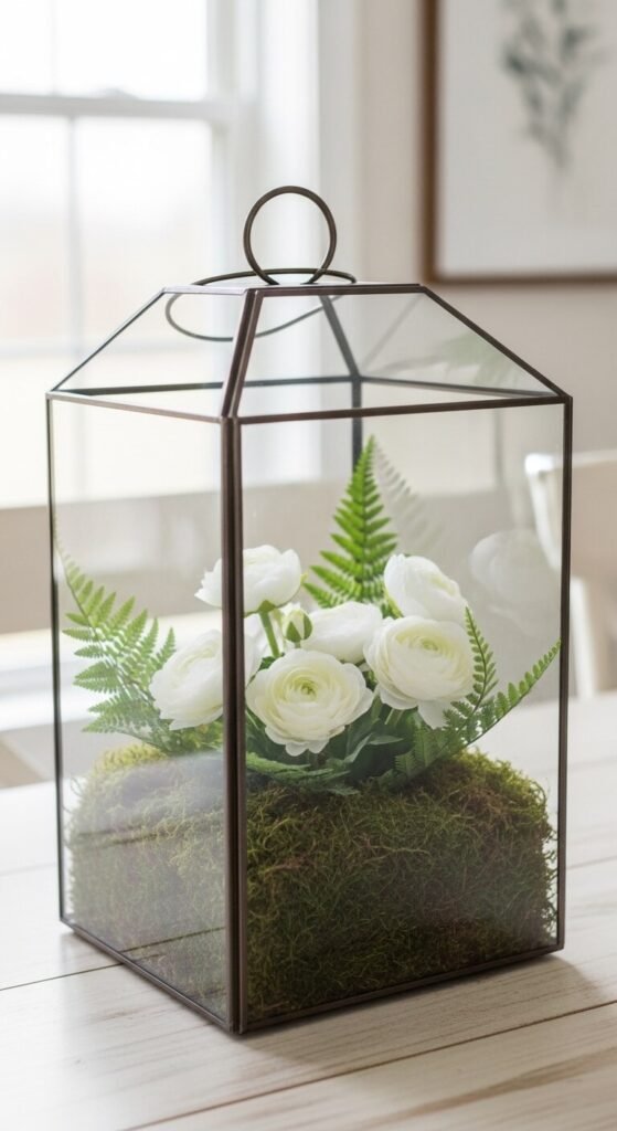 A glass terrarium lantern does double duty — it holds a candle and becomes a miniature garden. Layer a little pebbles, then moss, then small faux or real spring flowers inside around a tealight holder. The glass walls protect the flame and showcase the arrangement. Terrarium lanterns with hinged doors are widely available for $15–$25. Use faux flowers if you want a permanent display, or fresh ones for a special occasion. This is a genuine conversation piece.