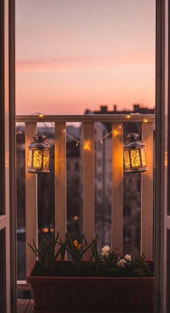 Balconies become truly special with lanterns and string lights combined. Hang small lanterns from the railing at even intervals and weave a strand of warm string lights through their handles and along the rail. This doubles the glow and gives the whole balcony a lit-from-within feel. Use battery-powered or plug-in string lights depending on your access to an outlet. A set of 10 small lanterns plus string lights runs about $25–$40 total. The result looks far more expensive.
