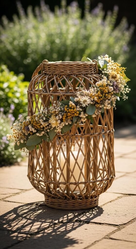 2. Wicker Lanterns with Wildflower Accents