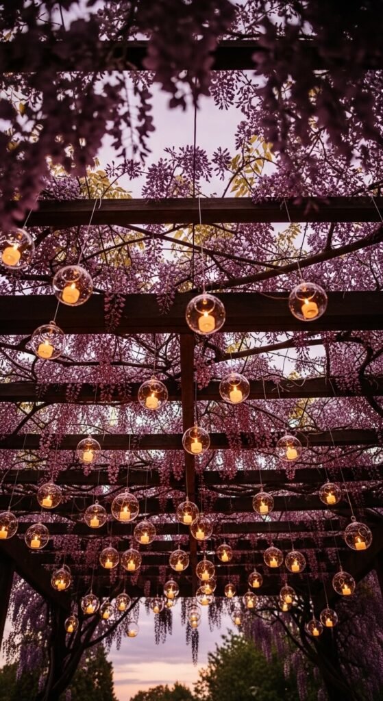 Glass orb lanterns create a dreamy floating effect when hung from a pergola or tree branch. Use clear fishing line to hang them at different heights for visual depth. Fill each one with a small pillar candle or battery-operated fairy lights. They’re widely available online for $8–$20 each. Group them in odd numbers — three or five — for a more natural look. This setup photographs beautifully and is a crowd-pleaser at outdoor gatherings.