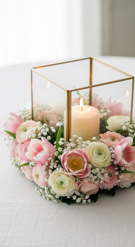 A glass lantern paired with fresh flowers makes a stunning table centerpiece. Place the lantern in the center and arrange a ring of spring flowers — tulips, ranunculus, or daisies — around the base. Use a florist foam ring soaked in water to keep flowers fresh for days. This works beautifully for Easter tables, bridal showers, or a simple Sunday dinner. The flowers cost under $10 from a grocery store. Swap them out weekly for a new look.
