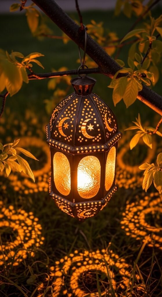 These lanterns cast incredible patterned shadows at night. The star and diamond cutouts glow against garden walls or fence panels in the most beautiful way. You can find authentic Moroccan-style lanterns online for $12–$25. Hang one from a tree branch or shepherd’s hook near a seating area. They are durable in mild spring weather and look exotic without requiring any DIY effort. Pair with a warm amber candle for the richest light.
