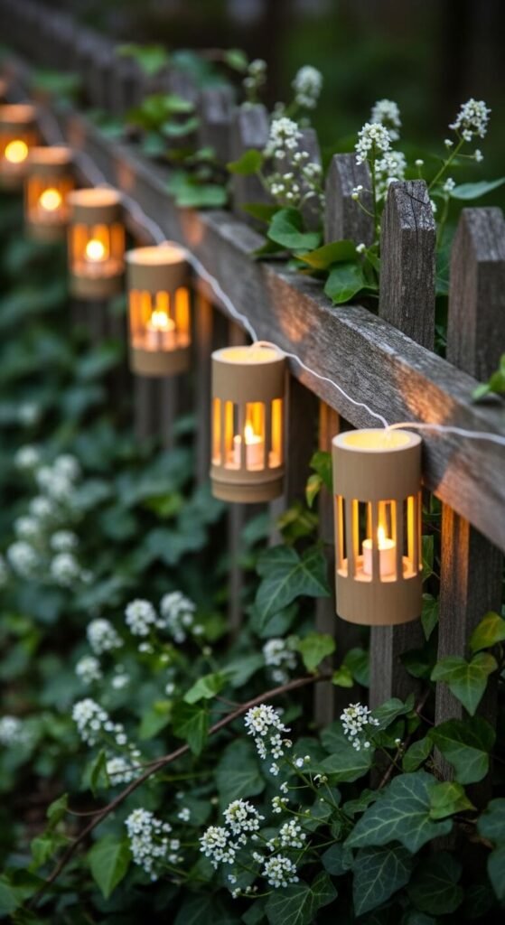 Bamboo lanterns have a lightweight, airy look that suits spring perfectly. String a row of them along a garden fence using jute twine for a relaxed, natural aesthetic. Battery-operated LED tealights make them completely safe and maintenance-free. A set of 10 bamboo lanterns can be found online for under $20. They are lightweight and easy to hang without tools. This is one of the fastest ways to transform a plain fence into a feature.